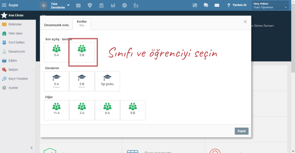 Sınıfı ve öğrenciyi seçin.