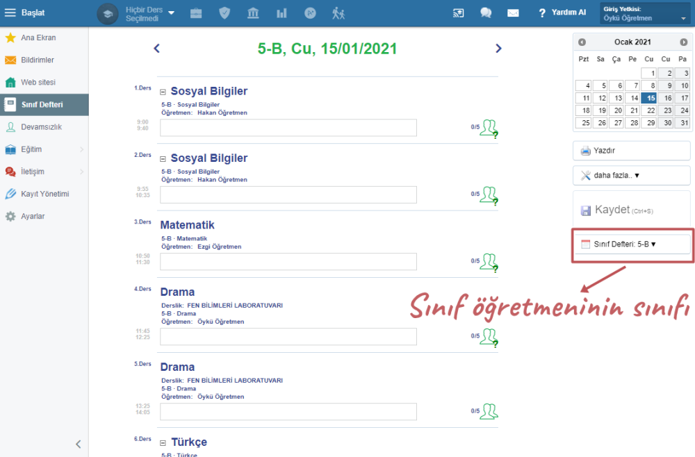 Sınıfınızı seçin. Sınıf öğretmeni olarak ders ekleyip var olan dersleri düzenleyebilir ve devamsızlık girişi yapabilirsiniz.