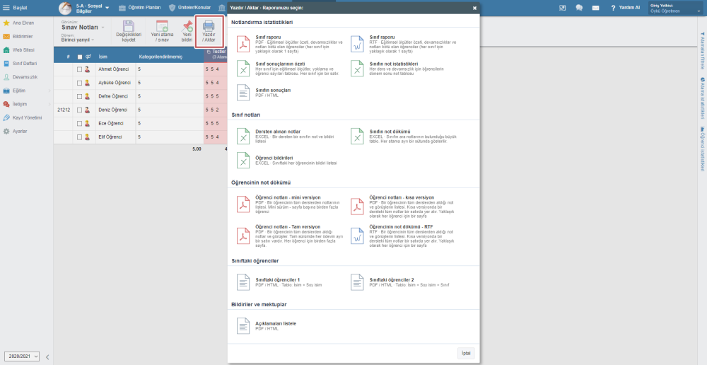 Üst menüden “Sınav Notları” sekmesini seçin ve Yazdır / Aktar’a tıklayın.