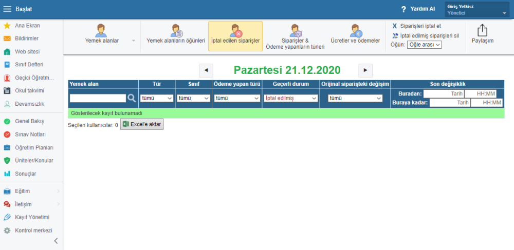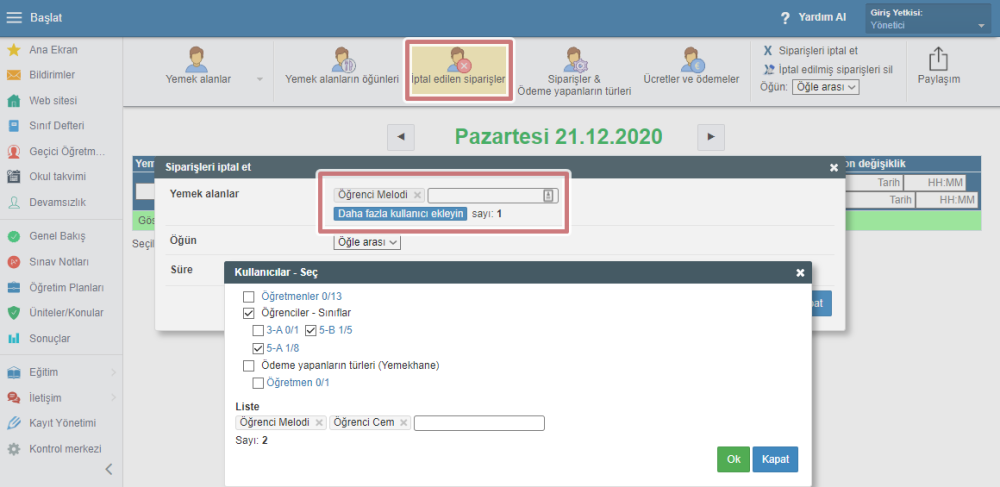 Buradan öğrencinin siparişini iptal edebilir veya iptal edilen siparişi silebilirsiniz.