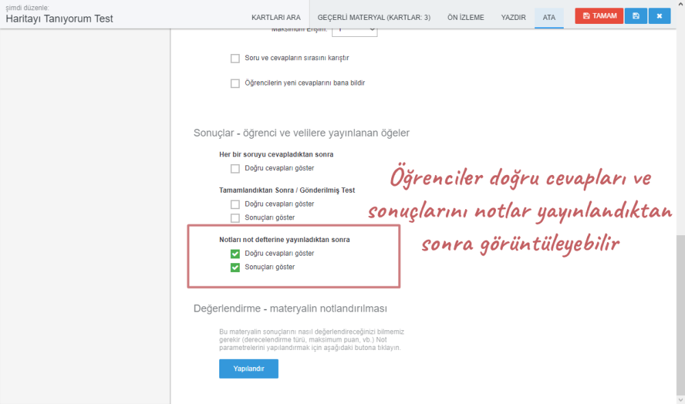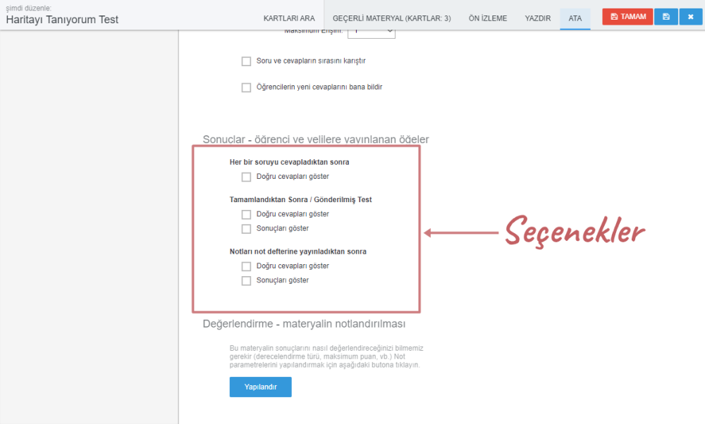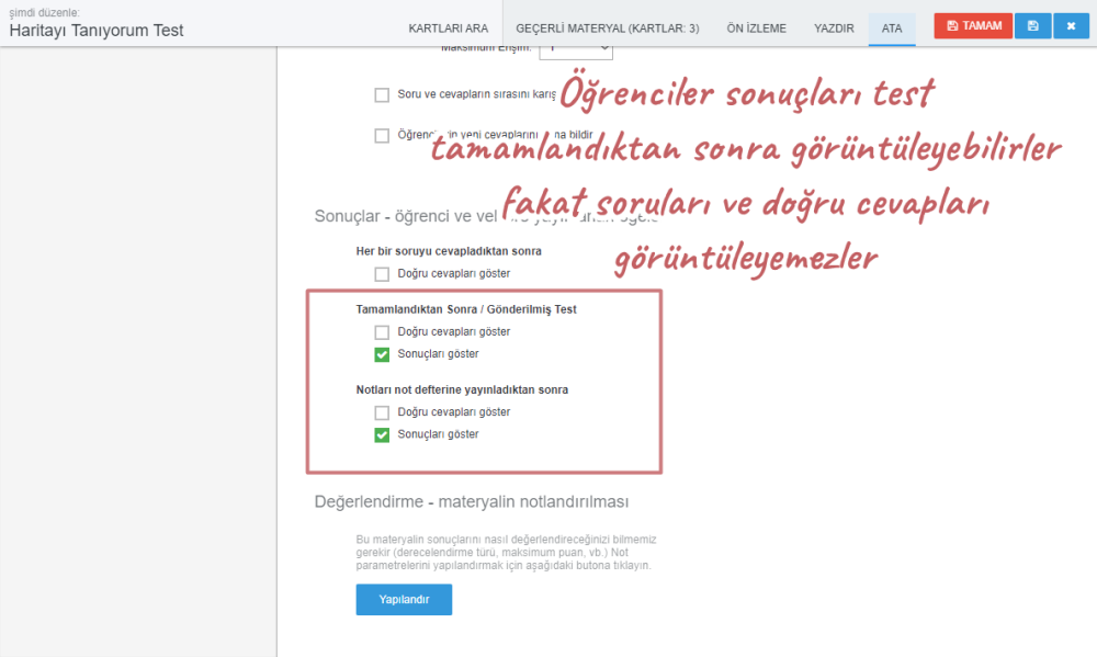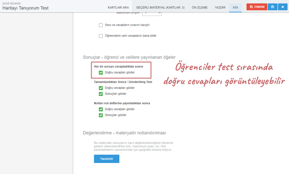 Varsayılan ayarlarda, öğrenciye verdiği cevabın doğru olup olmadığı anında gösterilir.