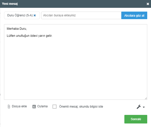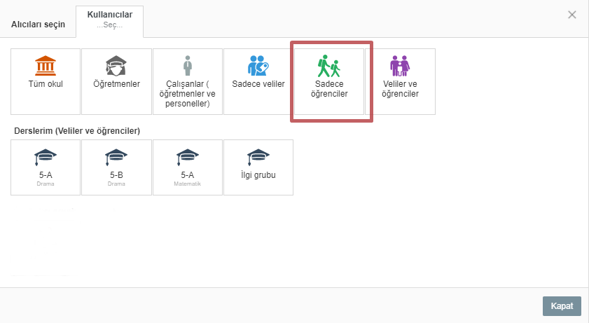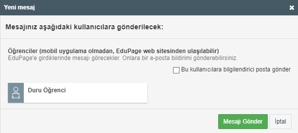 Mesajı kime göndermek istiyorsanız grubunu seçin. Biz aşağıdaki örnekte, bir öğrenciye mesaj göndermeyi seçtik.