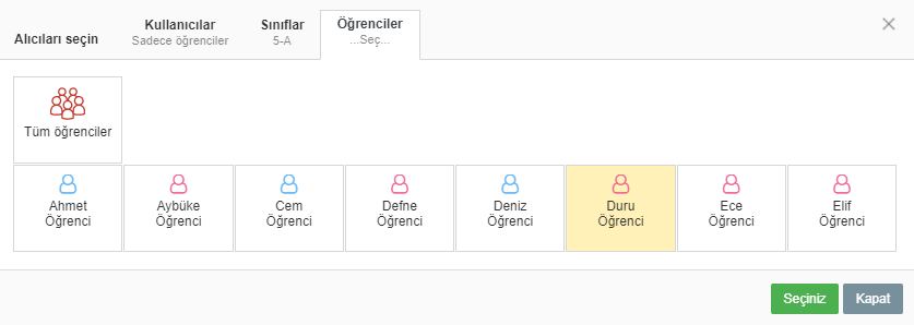 Mesajı göndermek istediğiniz öğrencinin ismine tıklayın. İsim sarı renkle vurgulanır. Aynı şekilde çoklu alıcı da seçebilirsiniz.