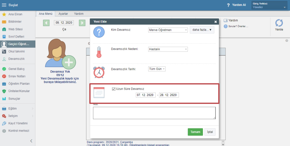 Öncelikle “Yeni Ekle” sekmesine tıklayın ve “Uzun Süre Devamsız” seçeneğini işaretleyin.