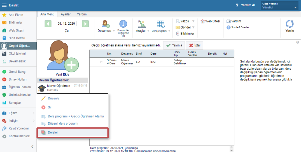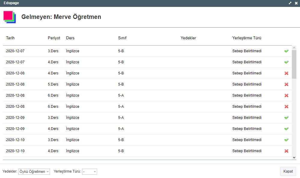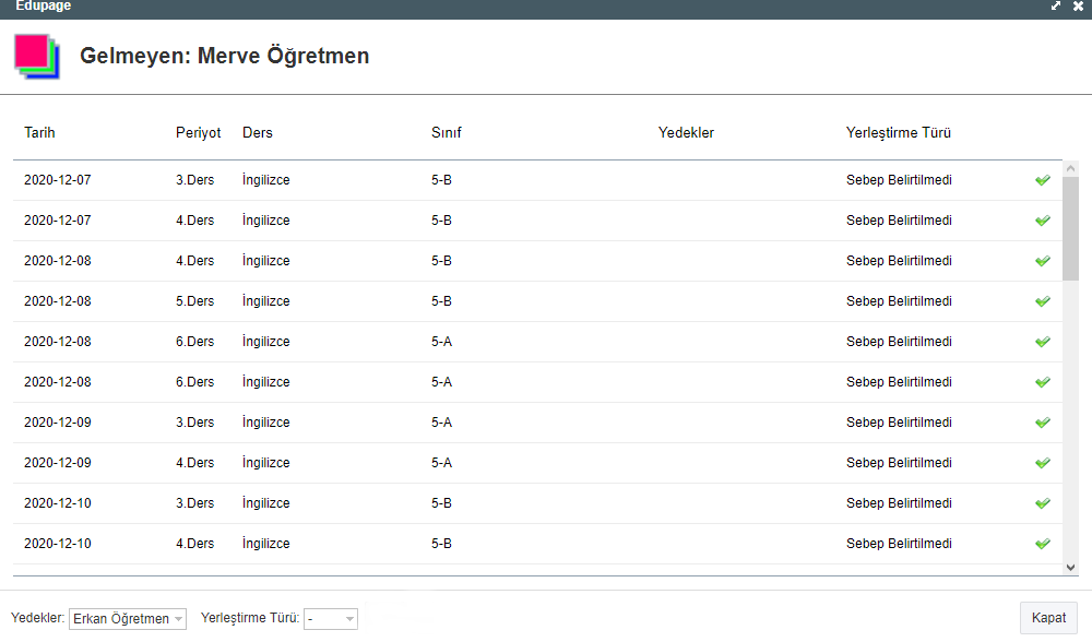 Hepsi bu kadar – Geçici Öğretmen Atama otomatik olarak izinli/raporlu öğretmenin tüm derslerini değiştirir.