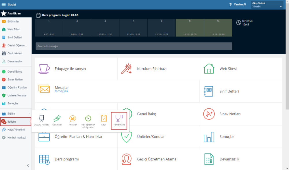 Yemekhane modülüne İletişim sekmesinden ulaşılabilir.
