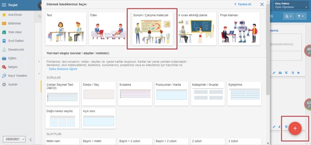 Dersinizi seçtikten sonra sağ alt köşedeki kırmızı + işaretine tıklayın ve Sunum/Çalışma materyali seçeneğini seçin.