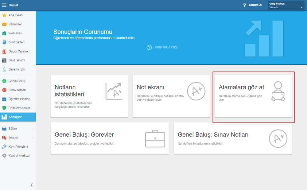 Yönetici, öğretmenin öğrencilere atadığı görevleri görebilir. Sol menüden Sonuçlar sekmesine tıklayın. Buradan “Atamalara göz at” sekmesine tıklayın.