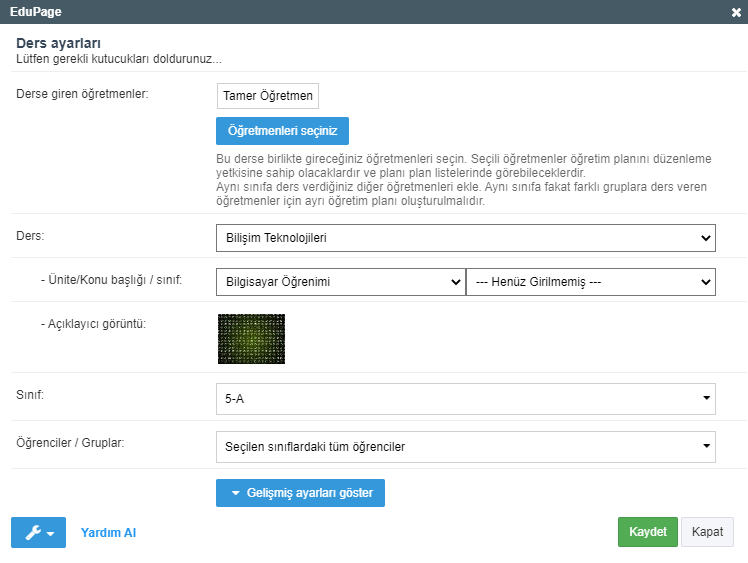 Ayarları değiştirmek için derse tıklamanız yeterli.