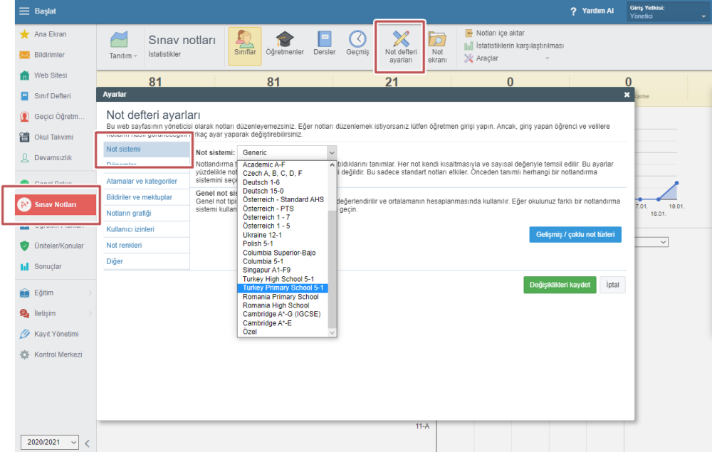 Yönetici, not defteri ayarları kısmından not sistemini ayarlayabilir. Ayarlar kısmında, önceden ayarlanmış not sistemlerinden birini (örneğin 1,2,3,4,5 veya A,B,C,D,E,F) seçebilir veya kendi not sisteminizi oluşturabilirsiniz. Kendi not sisteminizi oluşturmak için aşağıdaki adımları izleyin.