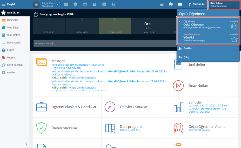 Eğer yönetici ve öğretmen hesabı kullanıyorsanız, birinden çıkış yapıp diğerine giriş yapmanız gerekmez.